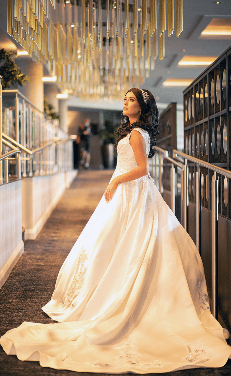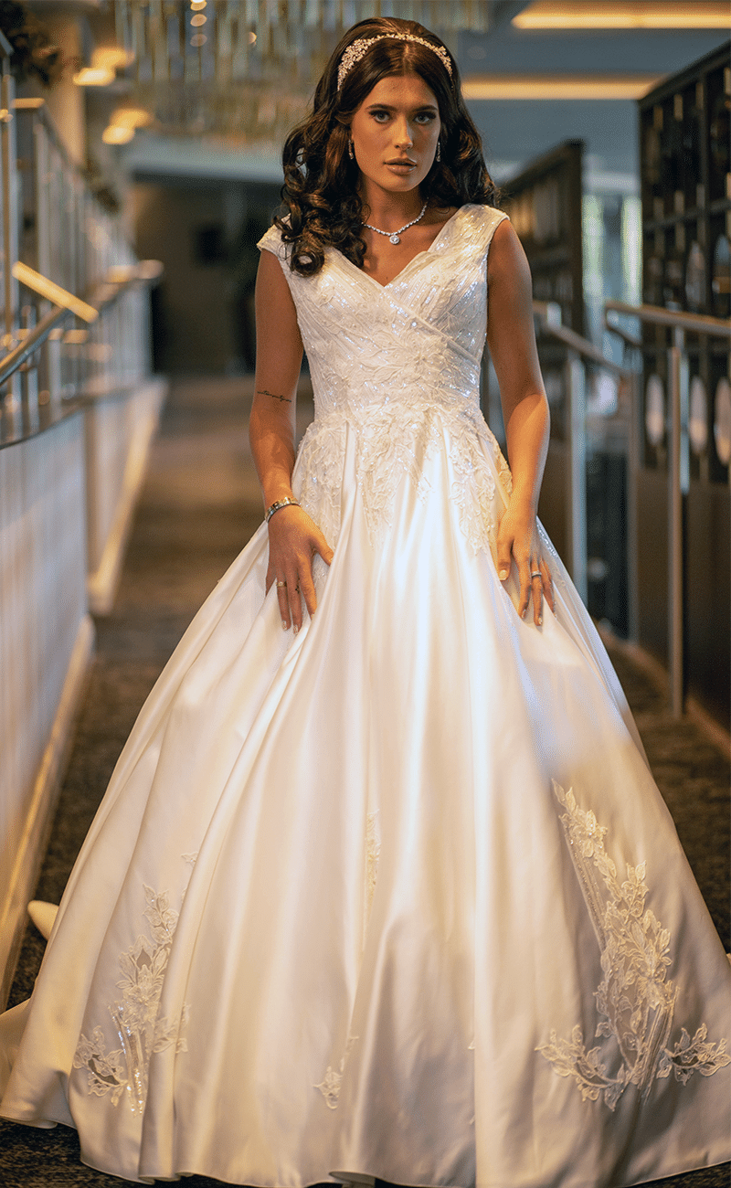 This duchess satin dress is the perfect combination of elegance and sophistication. Lillian features a classic V neckline and a full A-line skirt with applique lace motifs. Both the bodice and skirt feature beautiful beading and sequin detailing for that eye-catching shine. The cathedral length train gives this gown that extra touch of luxury, making your entrance one to remember!