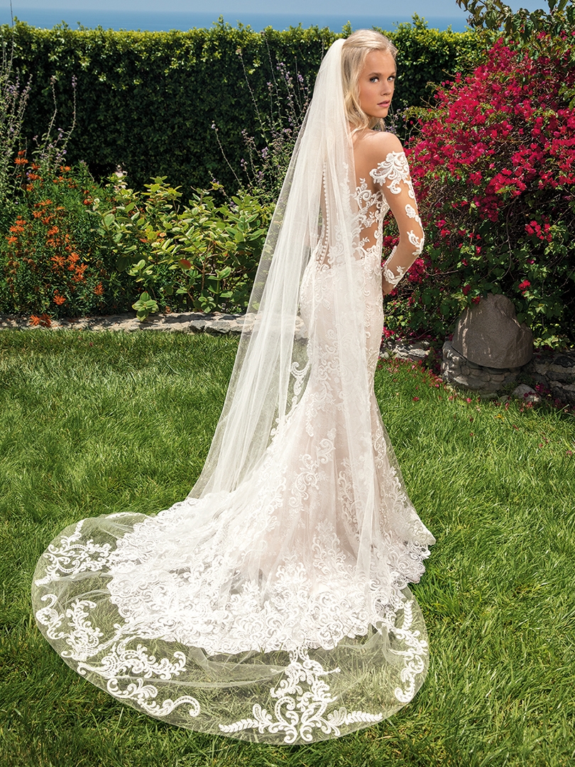 Swirling lace patterns swim along Madelyn’s fit and flare bodice, sitting atop a layer of perfecting satin, Chantilly lace and silky charmeuse. This Casablanca Bridal wedding dress with sleeves is effortlessly gorgeous, her plunging sweetheart neckline adding an element of seduction, while her illusion low-back is lined with a row of buttons that travel up the spine for an inviting finish.