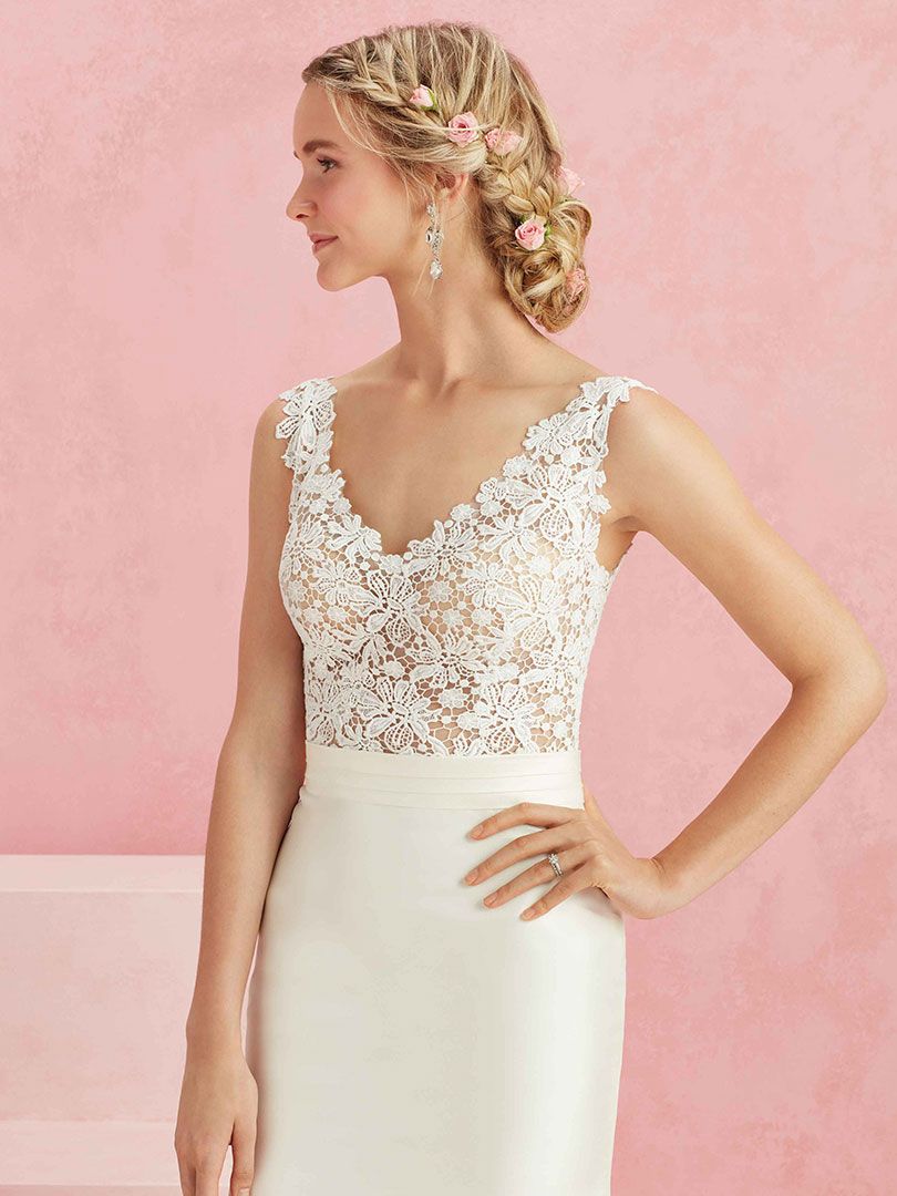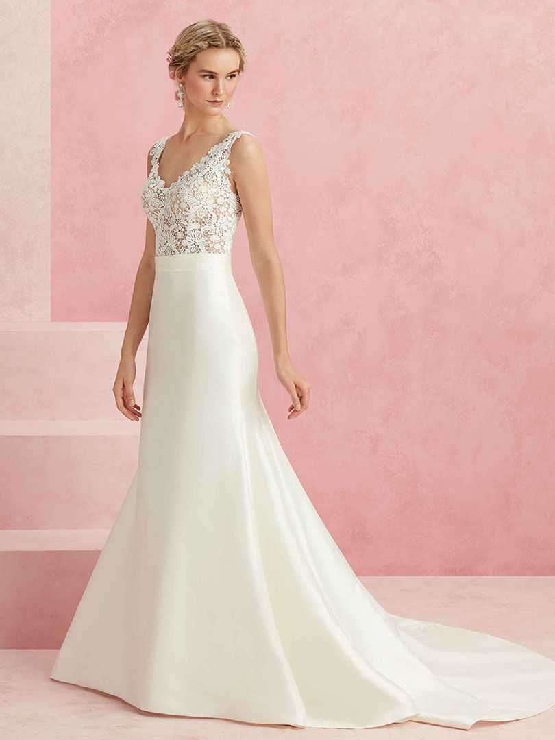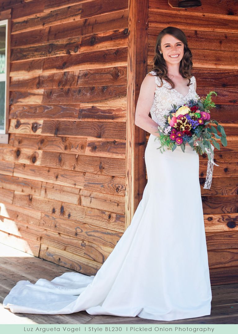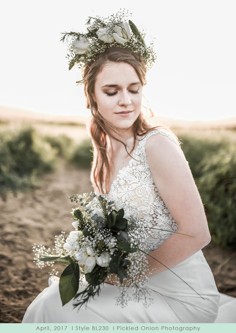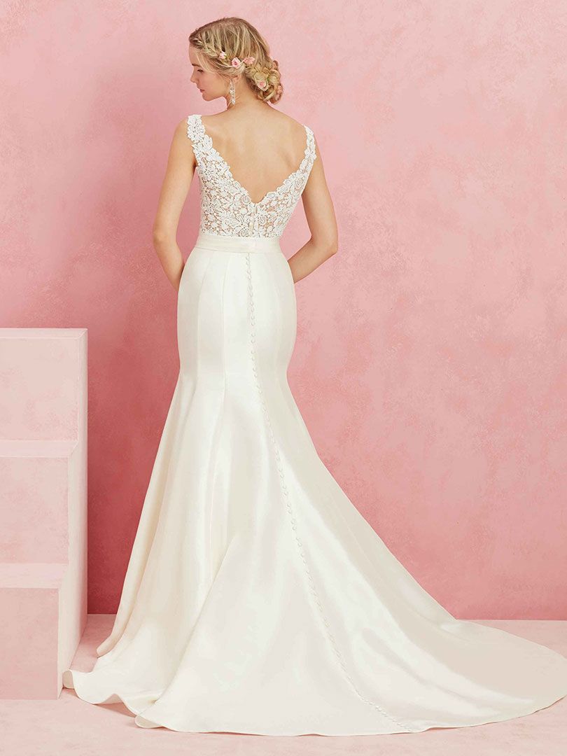A structured matte satin creates the beautiful flared skirt on Darling, which contains just the right amount of sheen, and a long trail of buttons up the entire length of the back. Contrastingly, the bodice is a crocheted floral lace in a V-shape both front and back. The two are joined in a perfect way with a satin belt at the natural waist.
