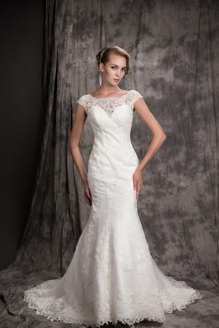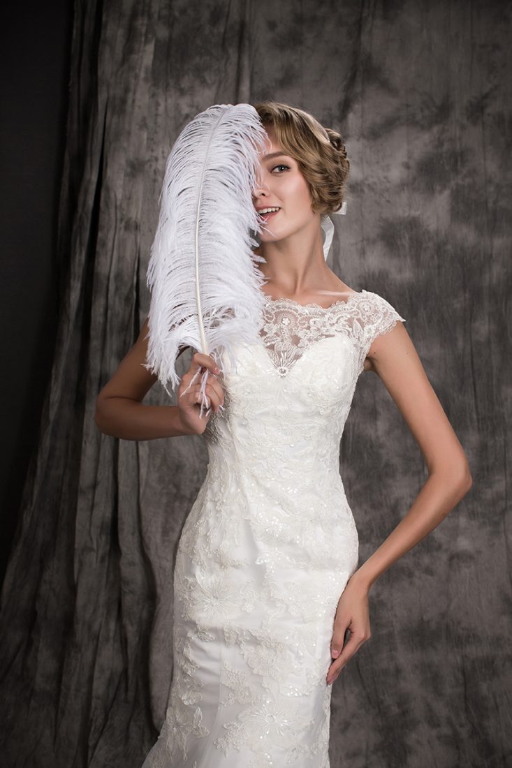Simple lines show off the stunning lace that makes this fishtail design so beautiful. The neckline is cut high at the front and back but this is sheer with a sweetheart shaping underneath dipping down at the back to the waist and featuring lots of tiny covered buttons fastening the lace. The dress is figure hugging through the body and then gently flares out from just above the knee and sweeping into a chapel train. The hem has a deep scalloped edge and the whole dress is delicately scattered with tiny sequins giving the whole dress a romantic shimmer. Available in Ivory and White.