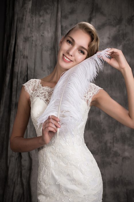 This fit and flare style lace gown highlights a beautiful body shape. Illusion lace V-neckline with a delicate cap sleeves. All sequins on the floral lace from the bodice to the chapel train, naturally catch the light and sparking spots are everywhere in bride’s every single movement.