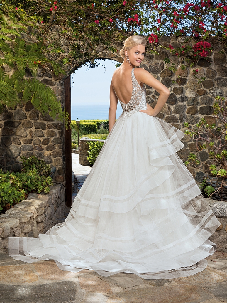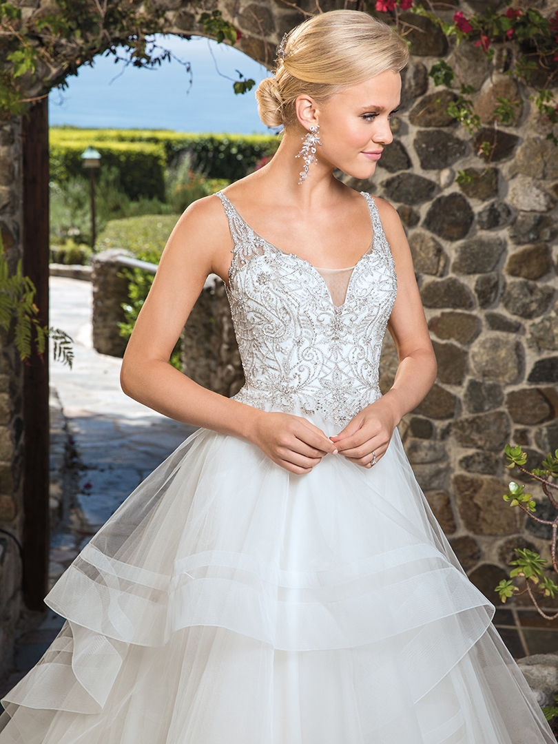 Layers upon layers of striking horsehair tulle make Whitney the ideal ballgown wedding dress! Her sweetheart neckline acts as a focal point for the beaded bodice, held up by subtle illusion straps that transition into a complementary illusion back. Dreamy and light, this stunning wedding dress by Casablanca Bridal is made for the modern fairytale bride.