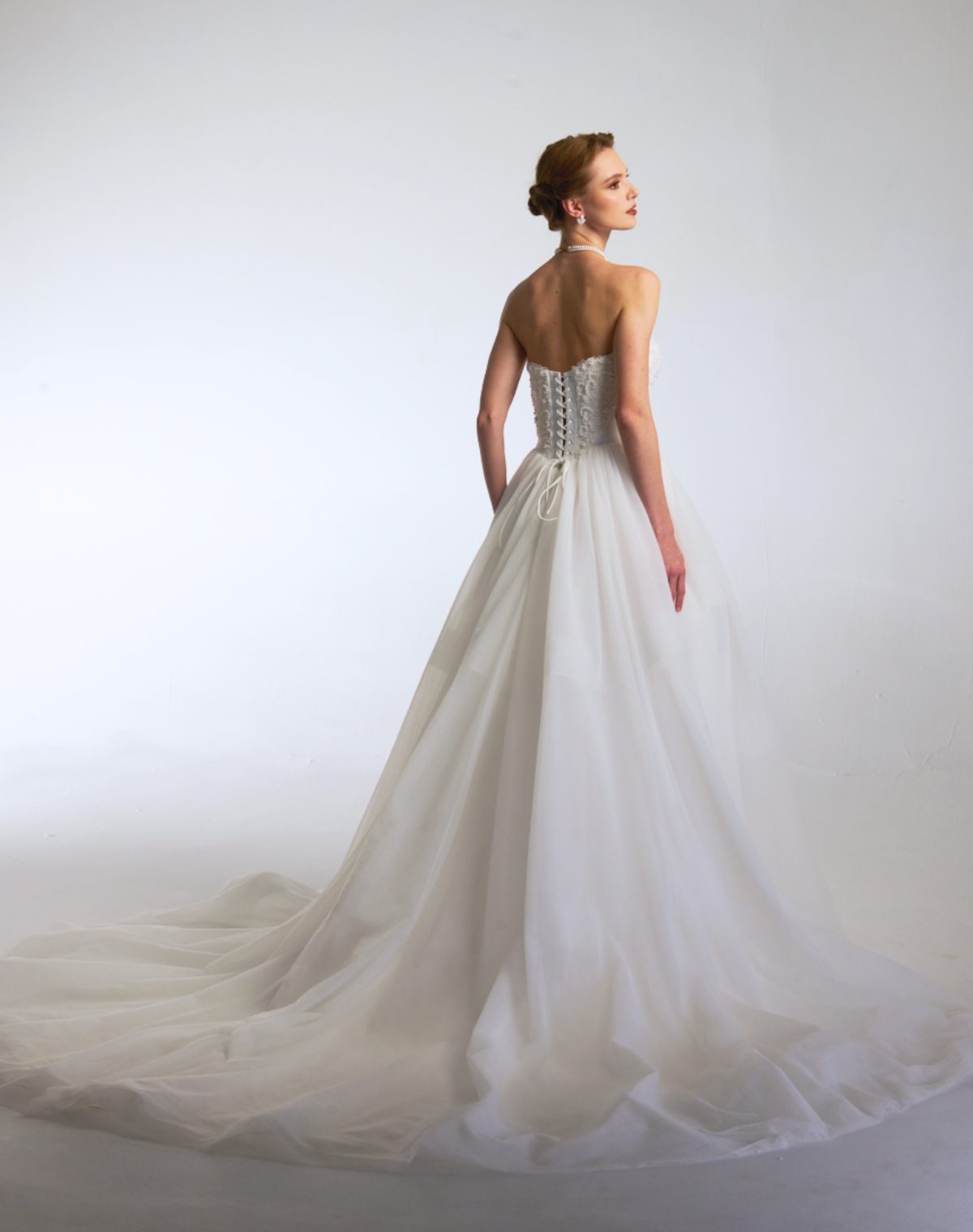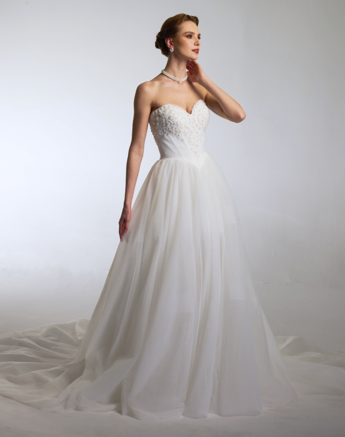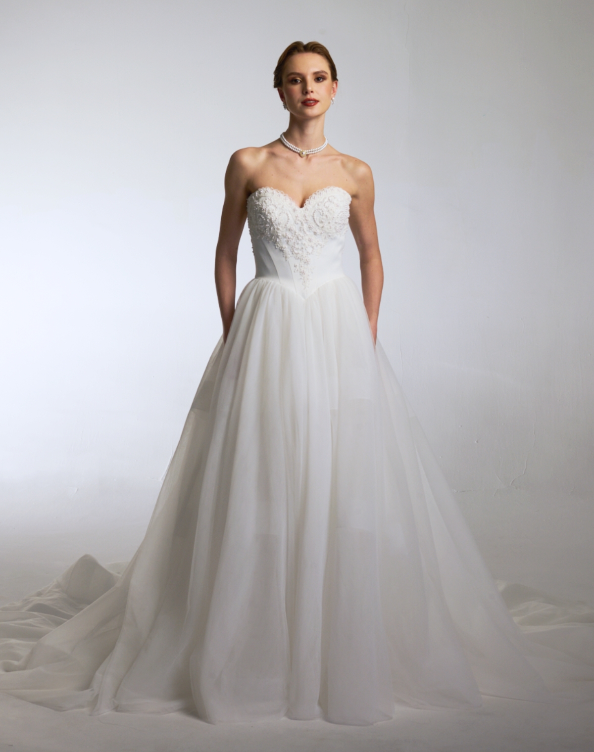 The Anabella gown is a romantic strapless ball gown designed for timeless bridal elegance. The sweetheart bodice features delicate lace appliqué and subtle beadwork that beautifully enhance the silhouette, while the structured corset back provides both support and refinement. Layers of soft tulle create a flowing, airy skirt that moves gracefully into a chapel-length train.
