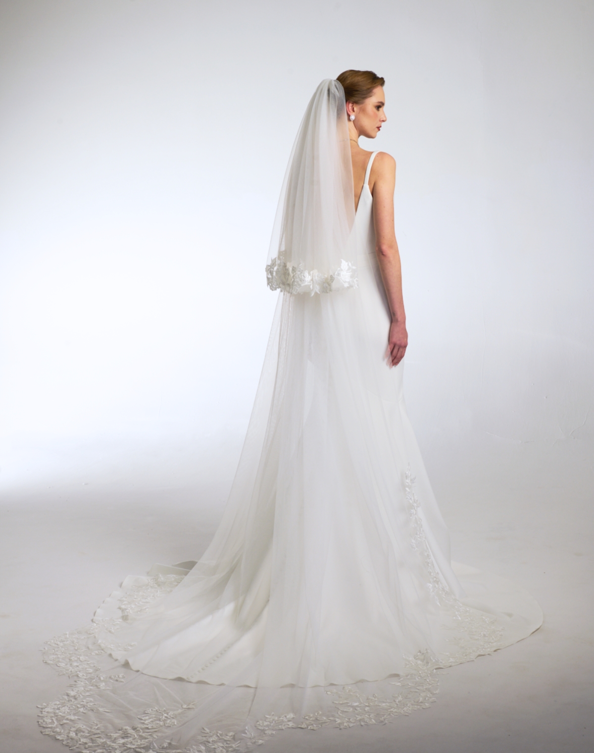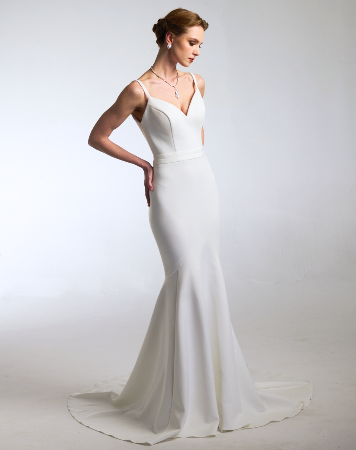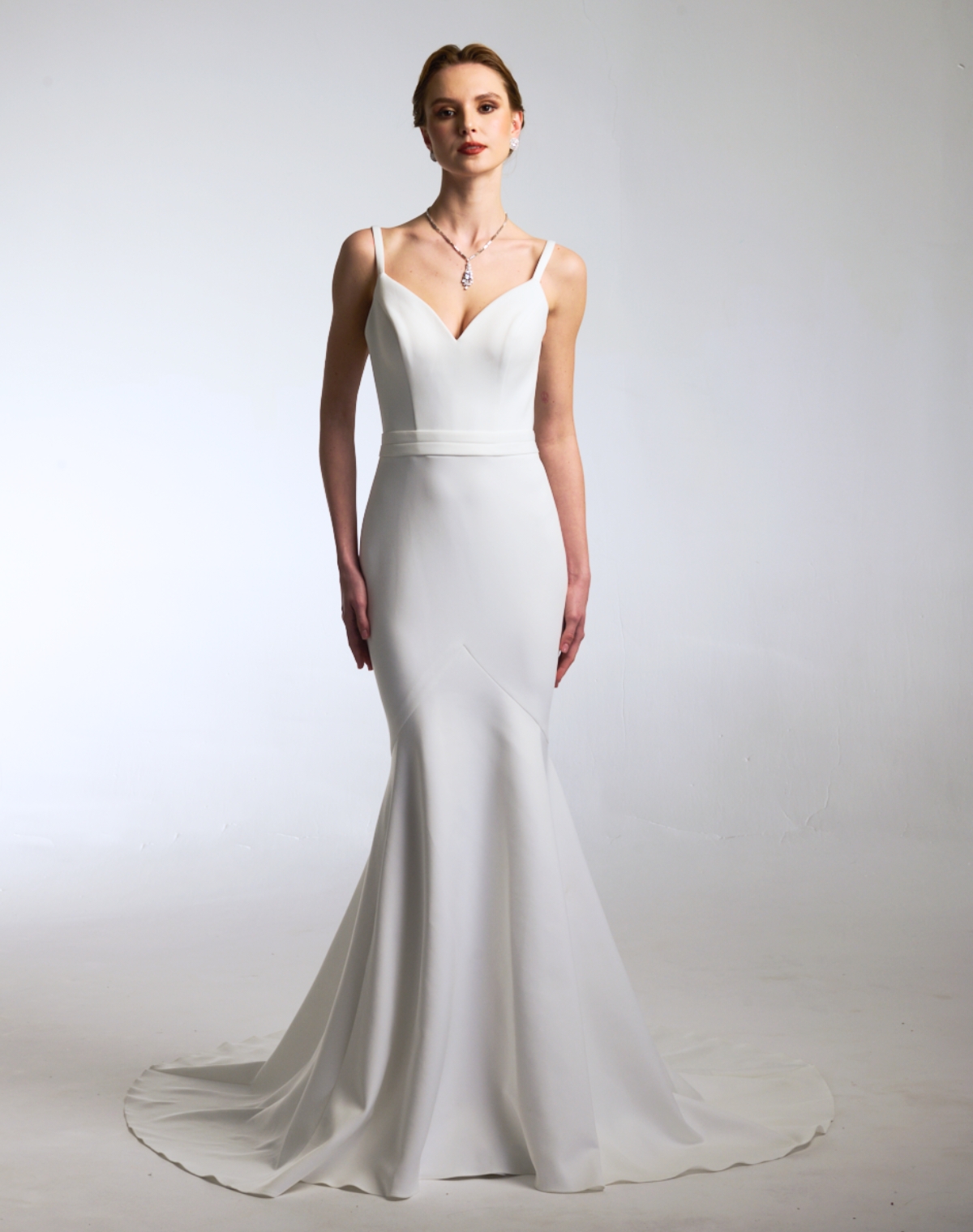The Cordelia gown is the epitome of modern bridal minimalism. Designed in a sleek mermaid silhouette, this elegant dress features delicate shoulder straps and a softly sculpted V-neckline that enhances the natural shape. The clean, structured bodice flows seamlessly into a fitted skirt, gently flaring at the hem into a graceful chapel-length train.