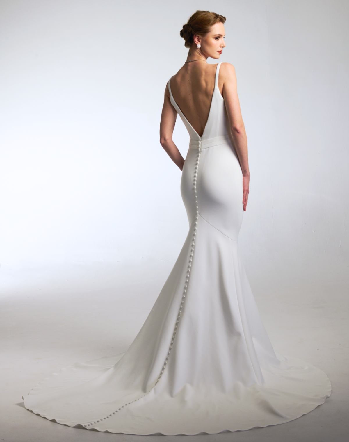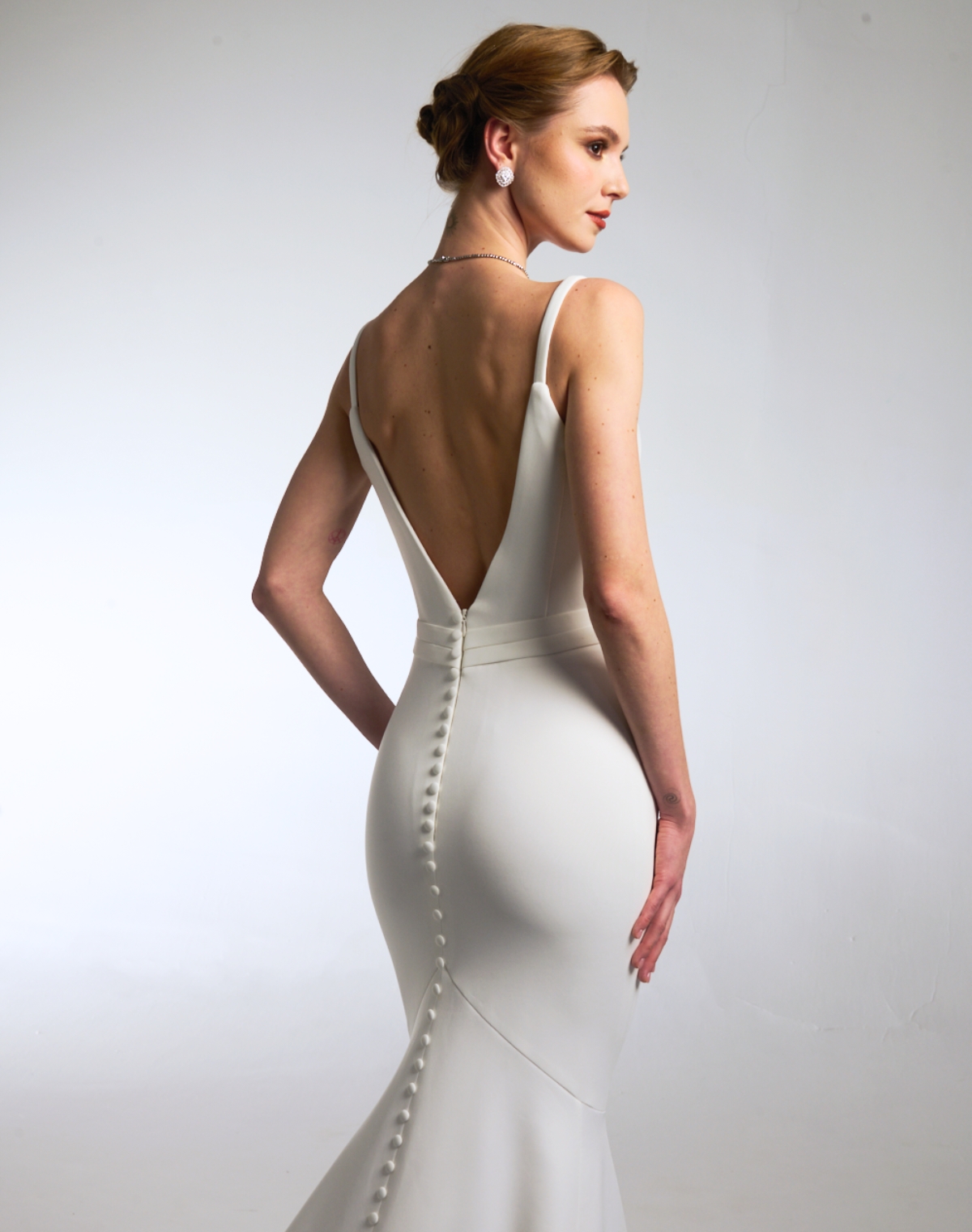 A striking low V-back is finished with a row of covered buttons, adding a timeless touch to this contemporary, refined design. Perfect for brides who love understated sophistication with flawless tailoring.