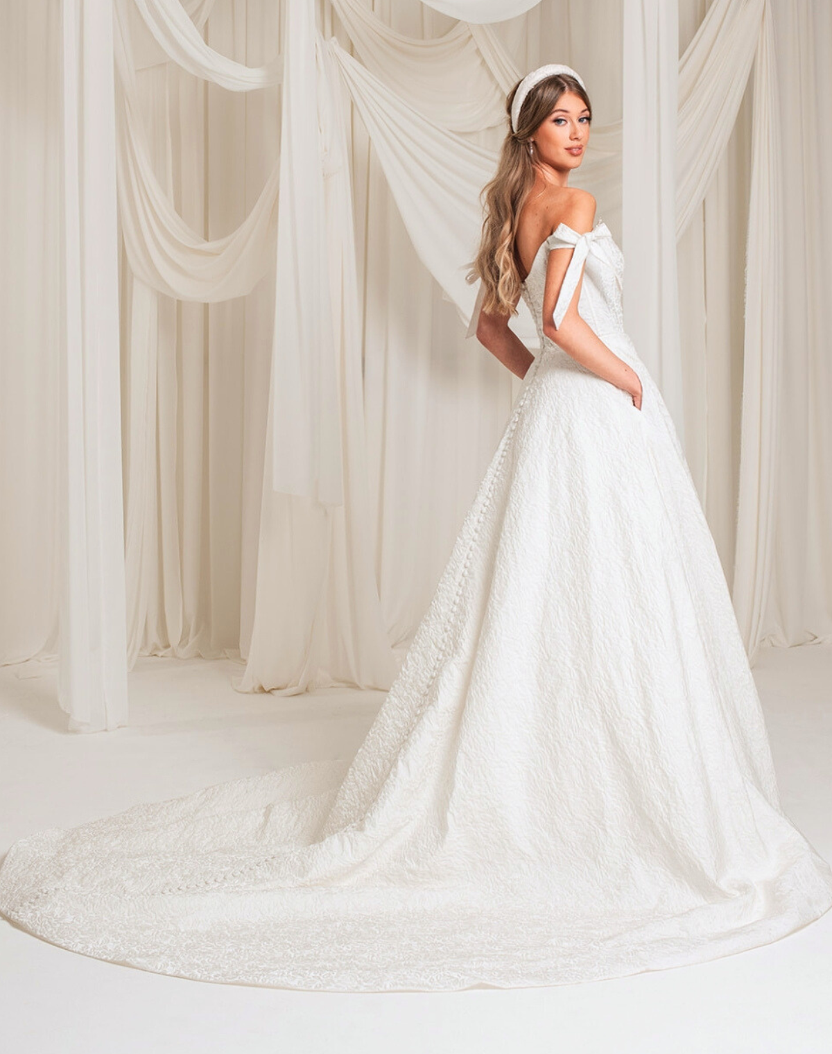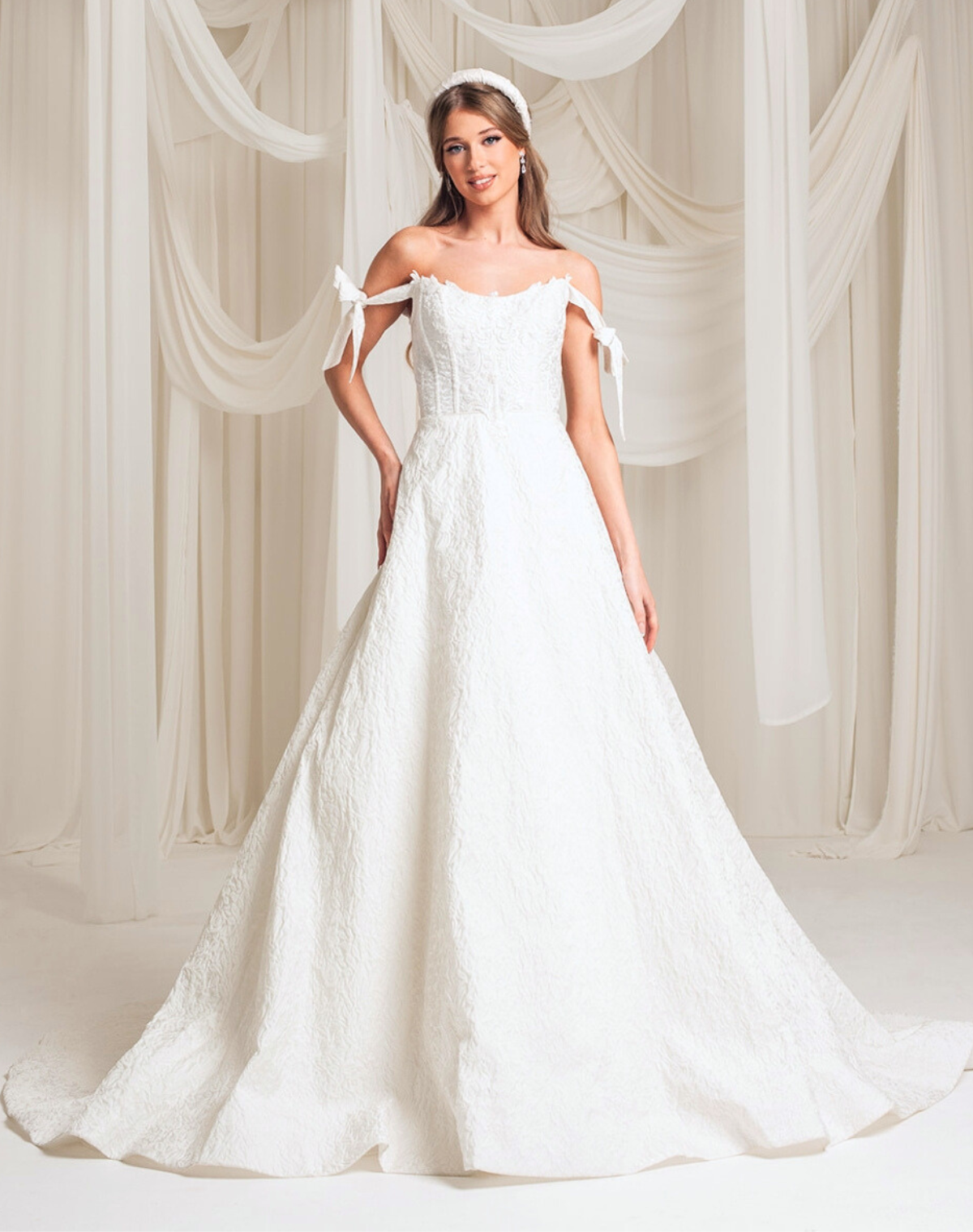 The Elara gown is a masterclass in modern romance and tactile elegance. Crafted from a stunning embossed floral jacquard, the dress offers a unique, structured texture that creates a sophisticated play of light and shadow. The bodice features a refined corset-inspired structure with a delicate scalloped neckline, perfectly balanced by whimsical, detachable off-the-shoulder ribbon ties. Flowing into a graceful A-line silhouette, Elara is designed for the bride who seeks a look that is both playfully feminine and timelessly chic.