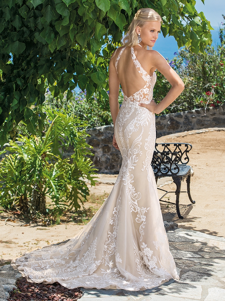 Irresistibly dreamy, Josephine by Casablanca Bridal is gorgeous in stretch chiffon and organza. Sequined lace glimmers subtly all throughout the fit and flare shape of this romantic wedding dress, comfortably hugging the bride’s figure. A classic halter neckline crosses over to the back of this sleeveless gown for an extra touch of modern sophisticated style.