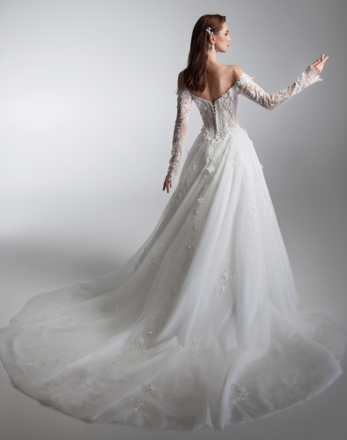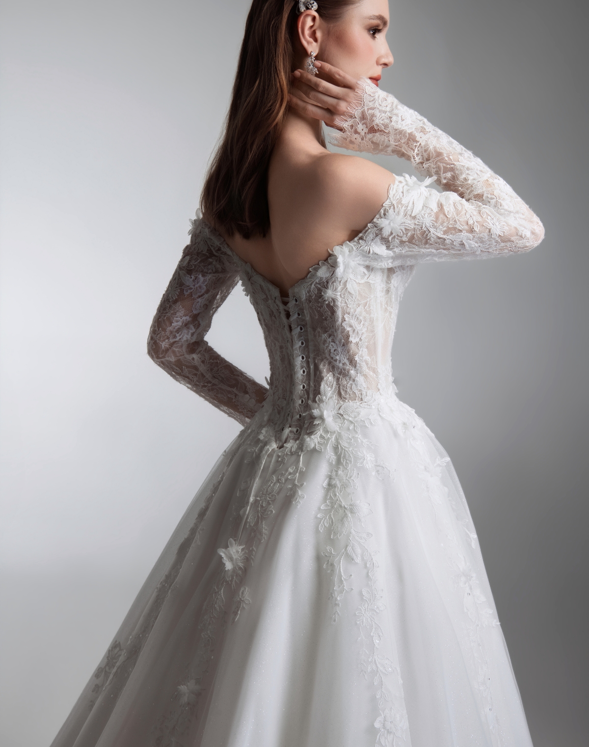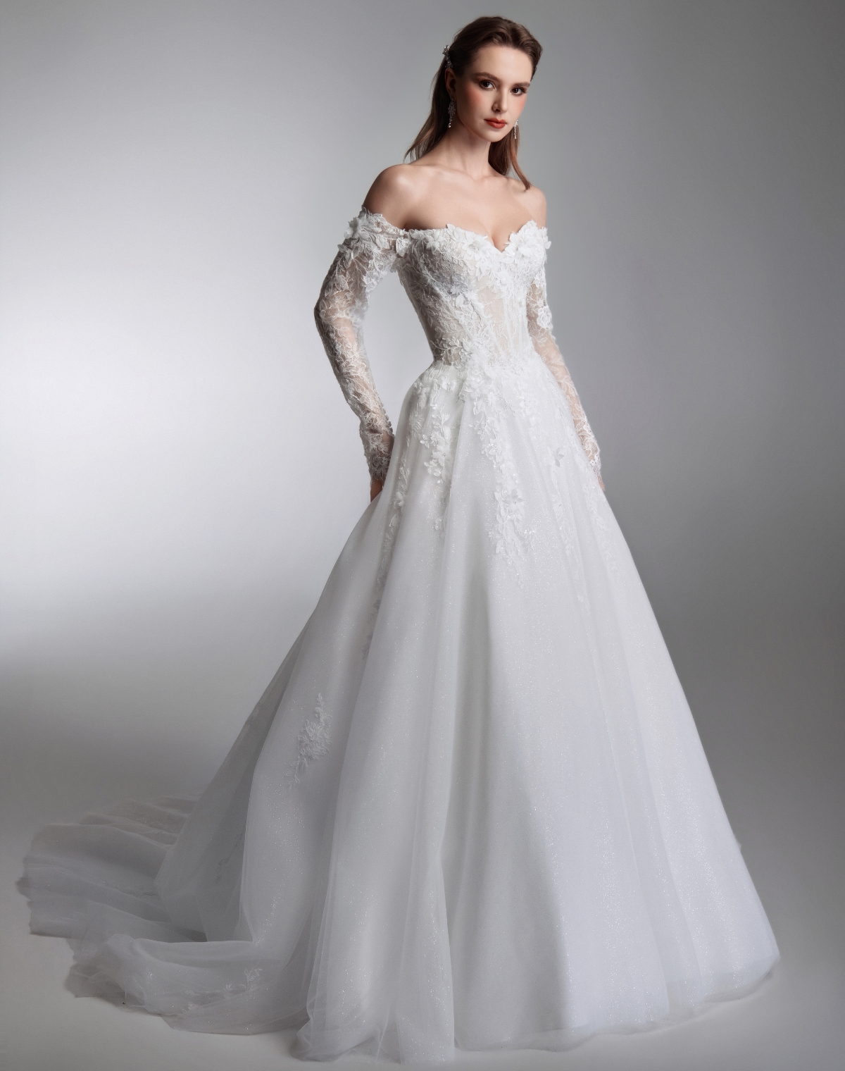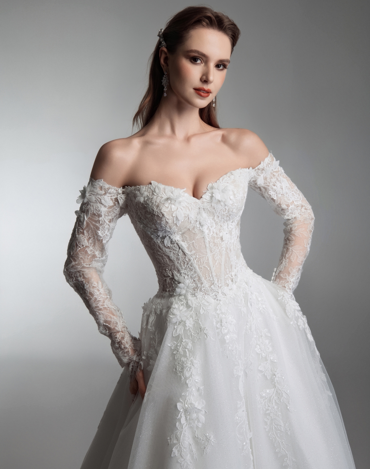 The Liora gown is a romantic lace ball gown designed for timeless bridal elegance. Featuring an off-shoulder sweetheart neckline, the structured corset bodice is adorned with delicate floral appliqué that enhances the silhouette beautifully. Sheer lace long sleeves add softness and sophistication, while the full flowing skirt creates graceful volume and movement with a chapel-length train.