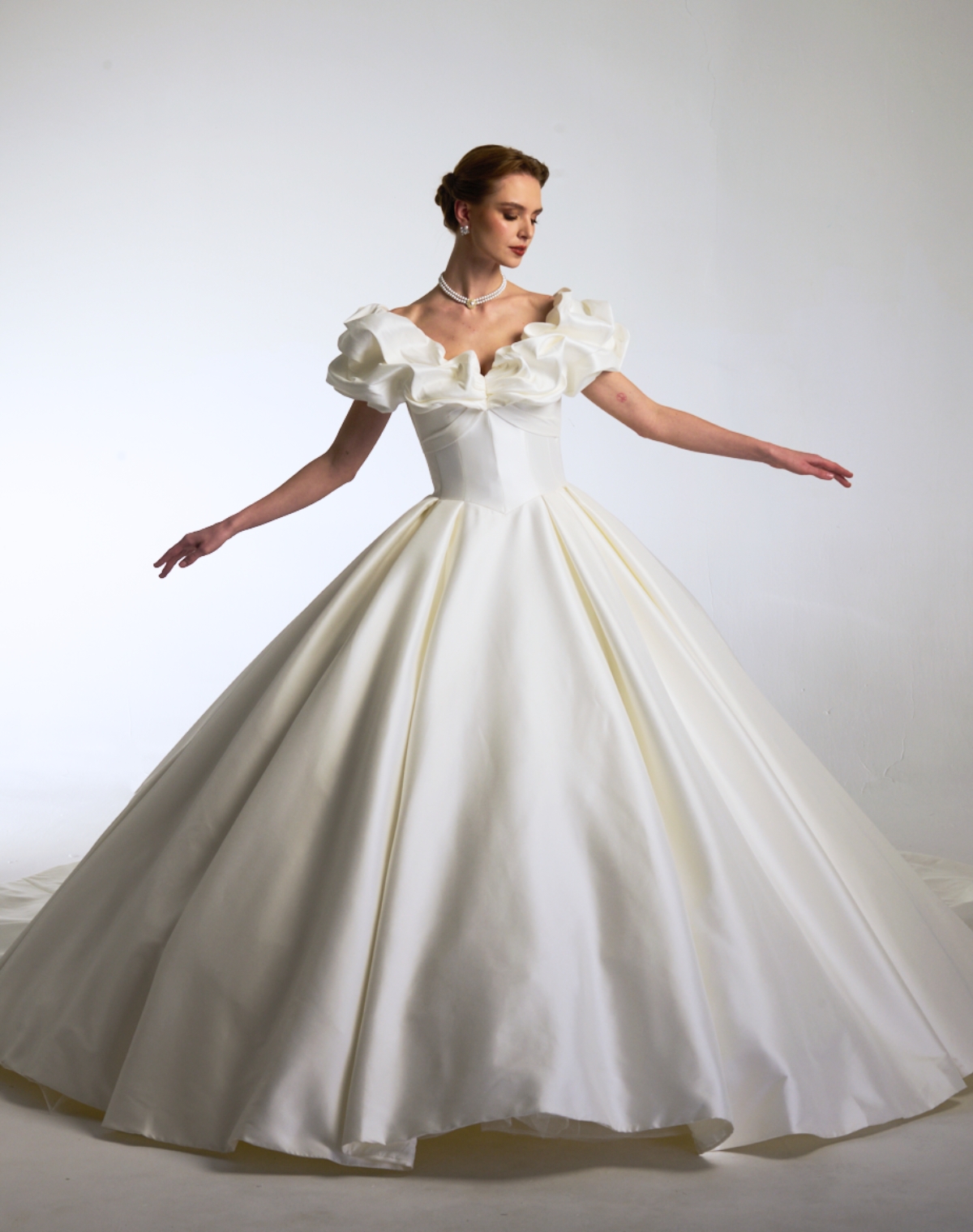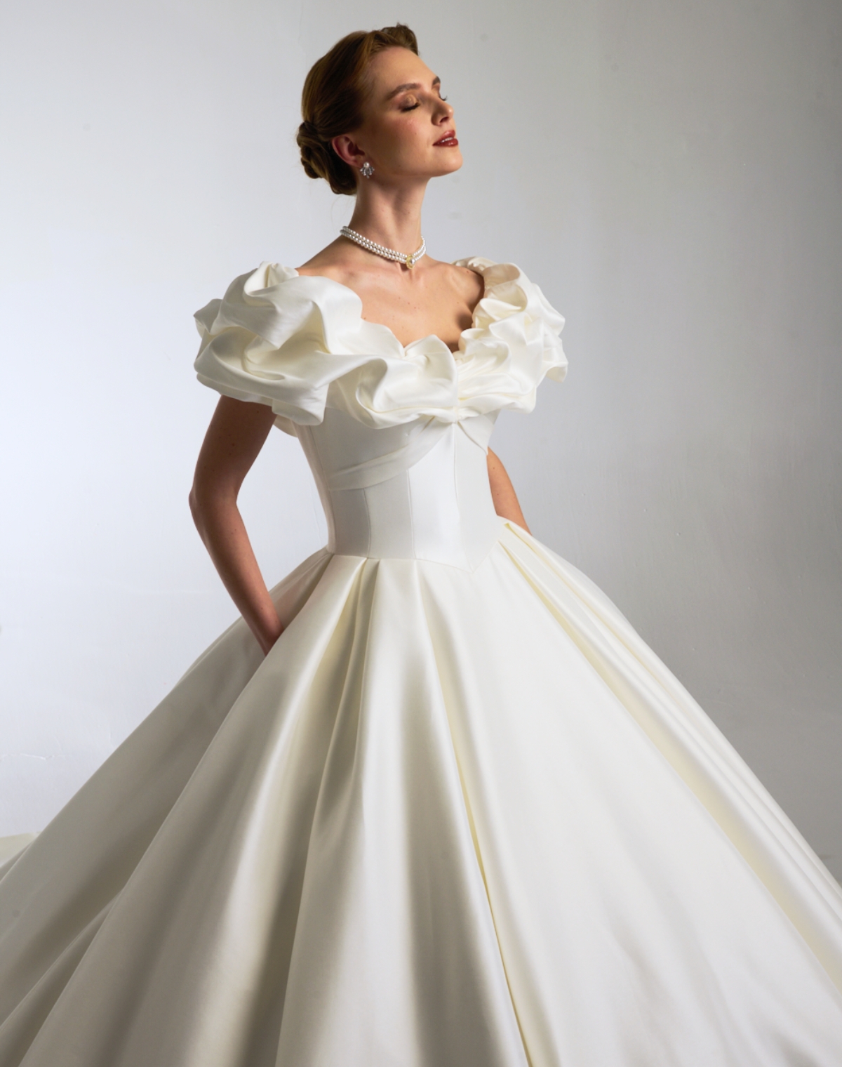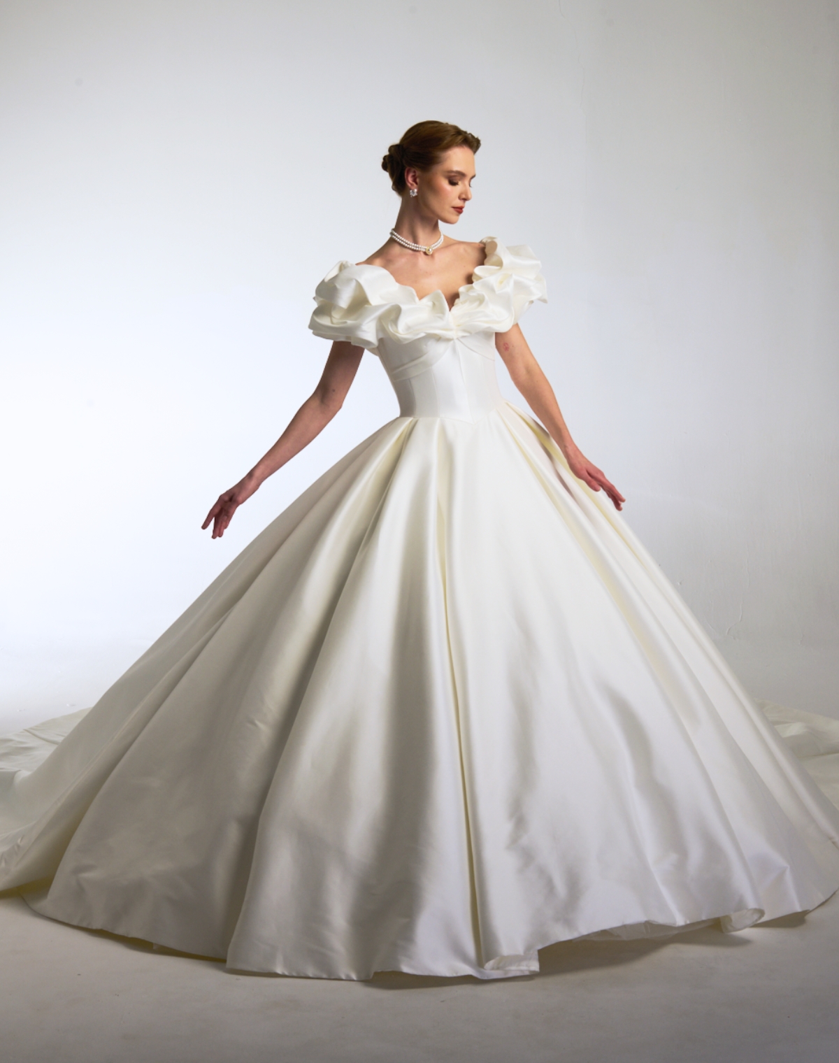 The Regina couture wedding dress is a statement of regal elegance and dramatic sophistication. Designed in a grand ball gown silhouette, this gown features a sculpted corset bodice crowned with a striking ruffled off-shoulder neckline that frames the décolletage beautifully.