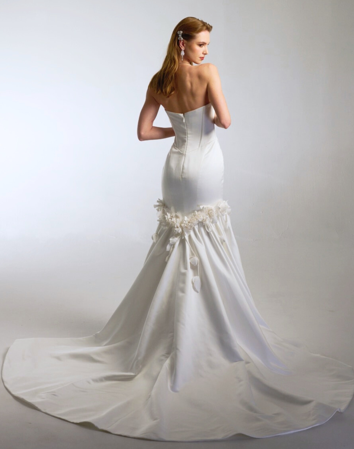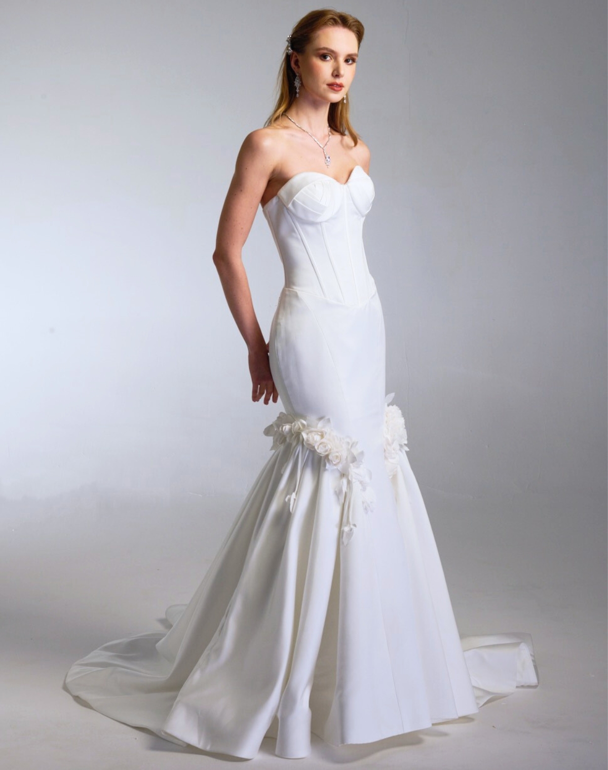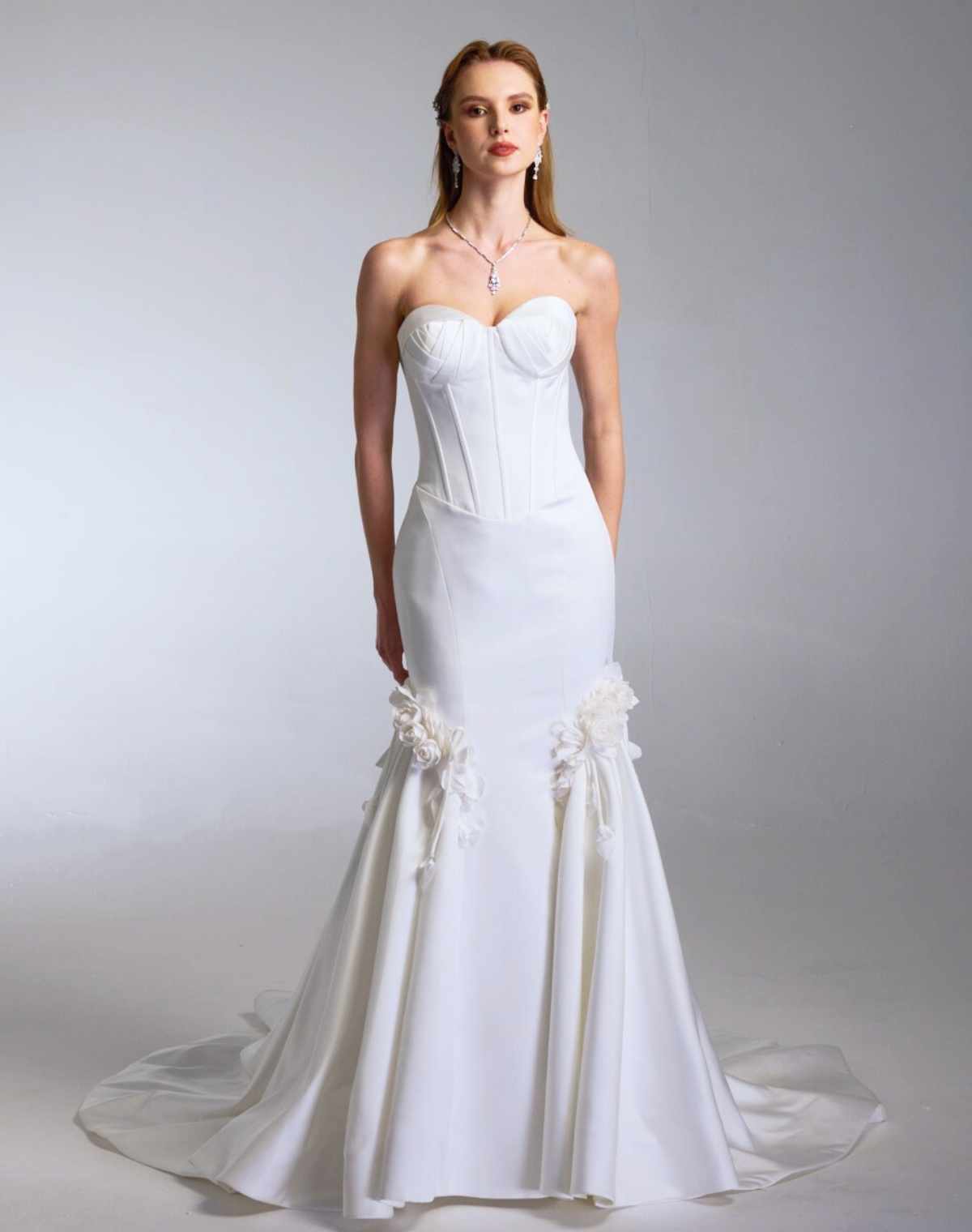 An elegant strapless mermaid gown crafted in a clean, structured silhouette. The corset-inspired bodice features sculpted seams that enhance the waist and create a refined, modern bridal look. The skirt hugs the hips before softly flaring into a graceful train, accented with delicate floral appliqués that add texture without overpowering the minimalist design. Timeless, sophisticated, and effortlessly feminine — ideal for a contemporary bride seeking understated luxury.